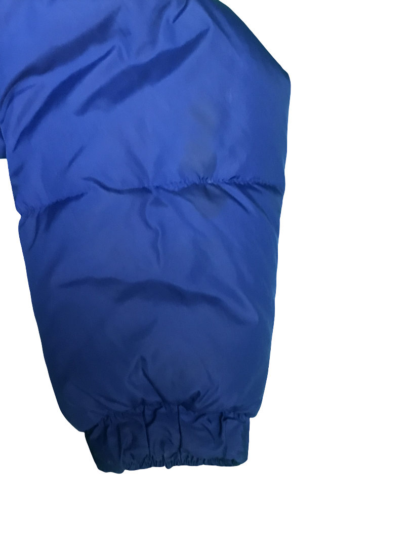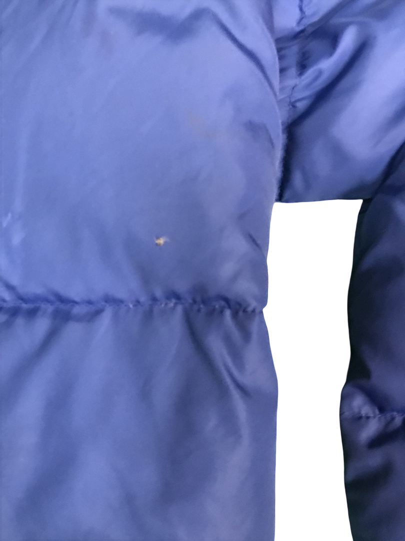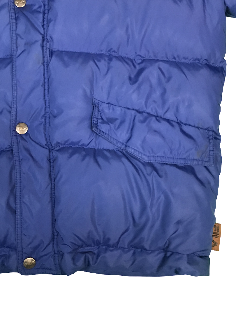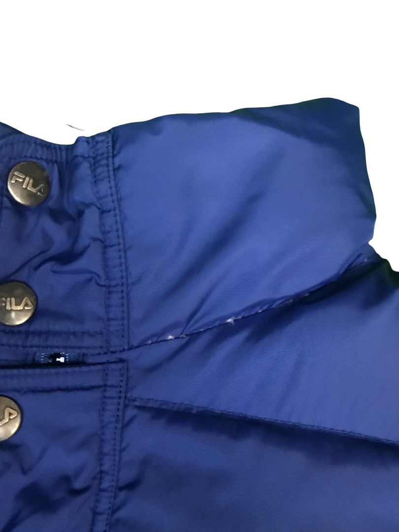 Blaue Daunenjacke von Fila. Recht guter Zustand. 2-3 sehr kleine Löcher und ein paar kaum erkennbare dunkle Flecken, die man auf den Fotos sehen kann. Größe fittet S-M.