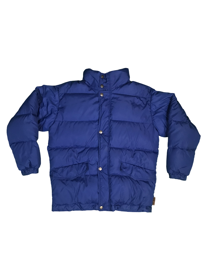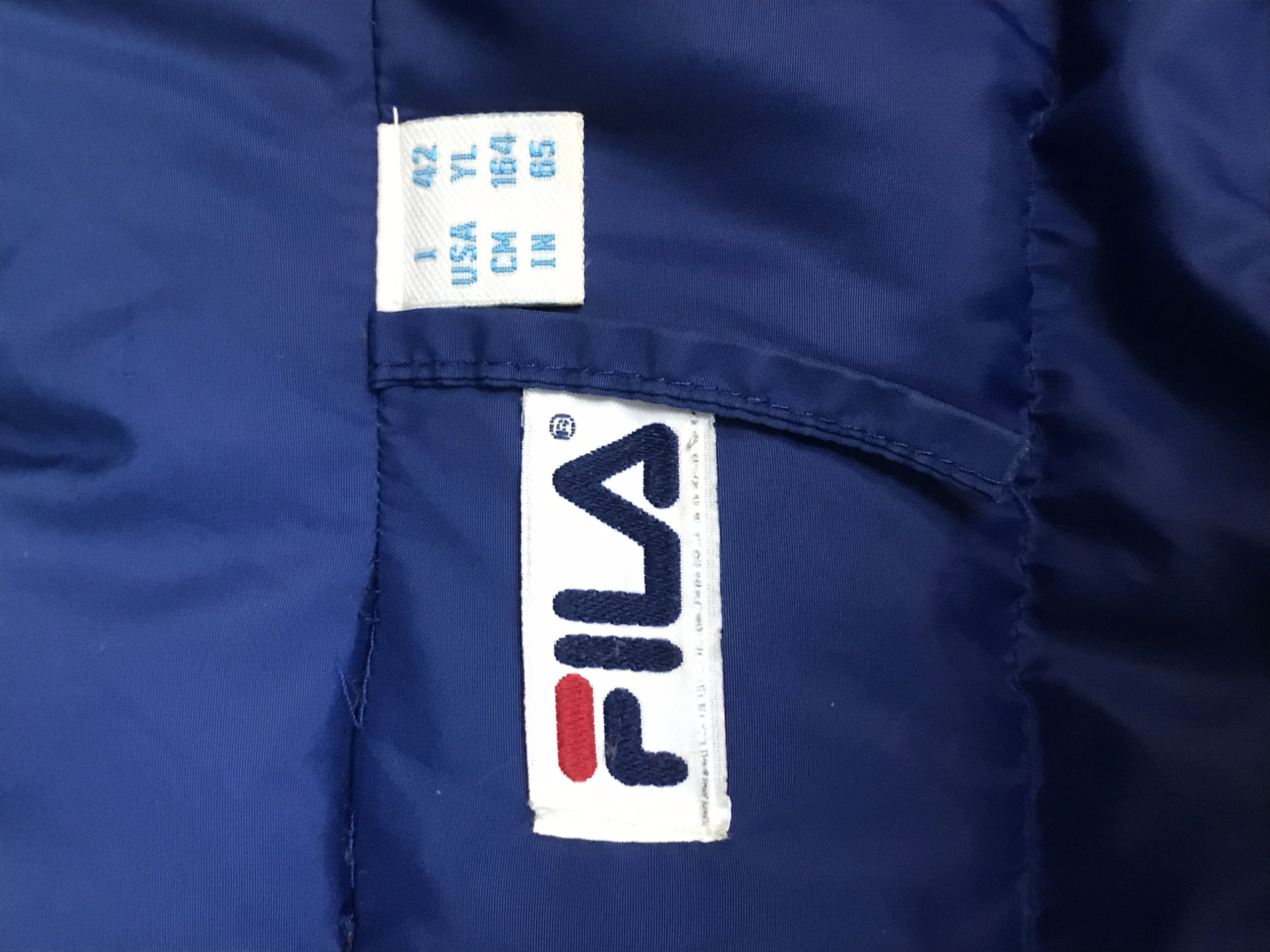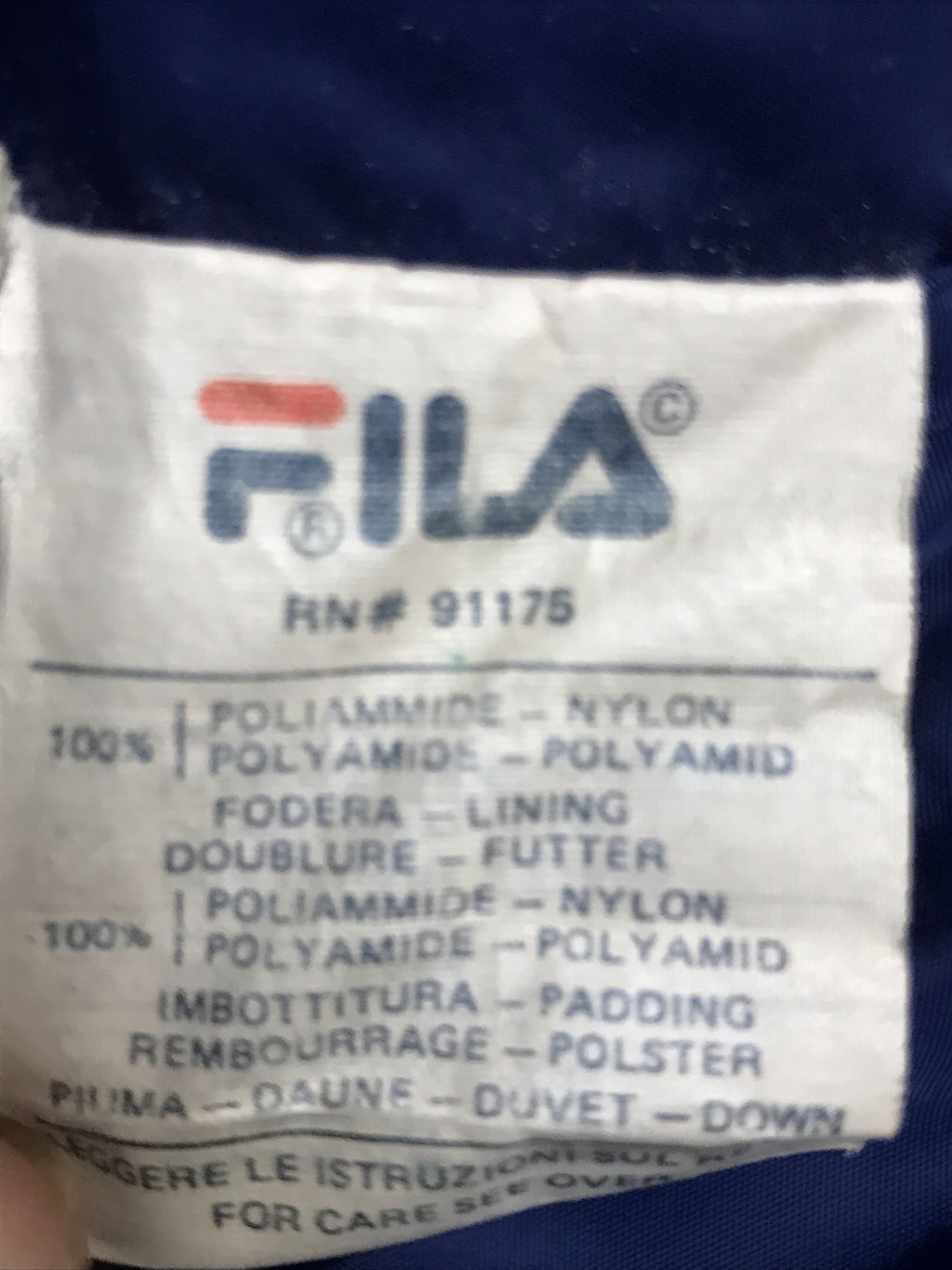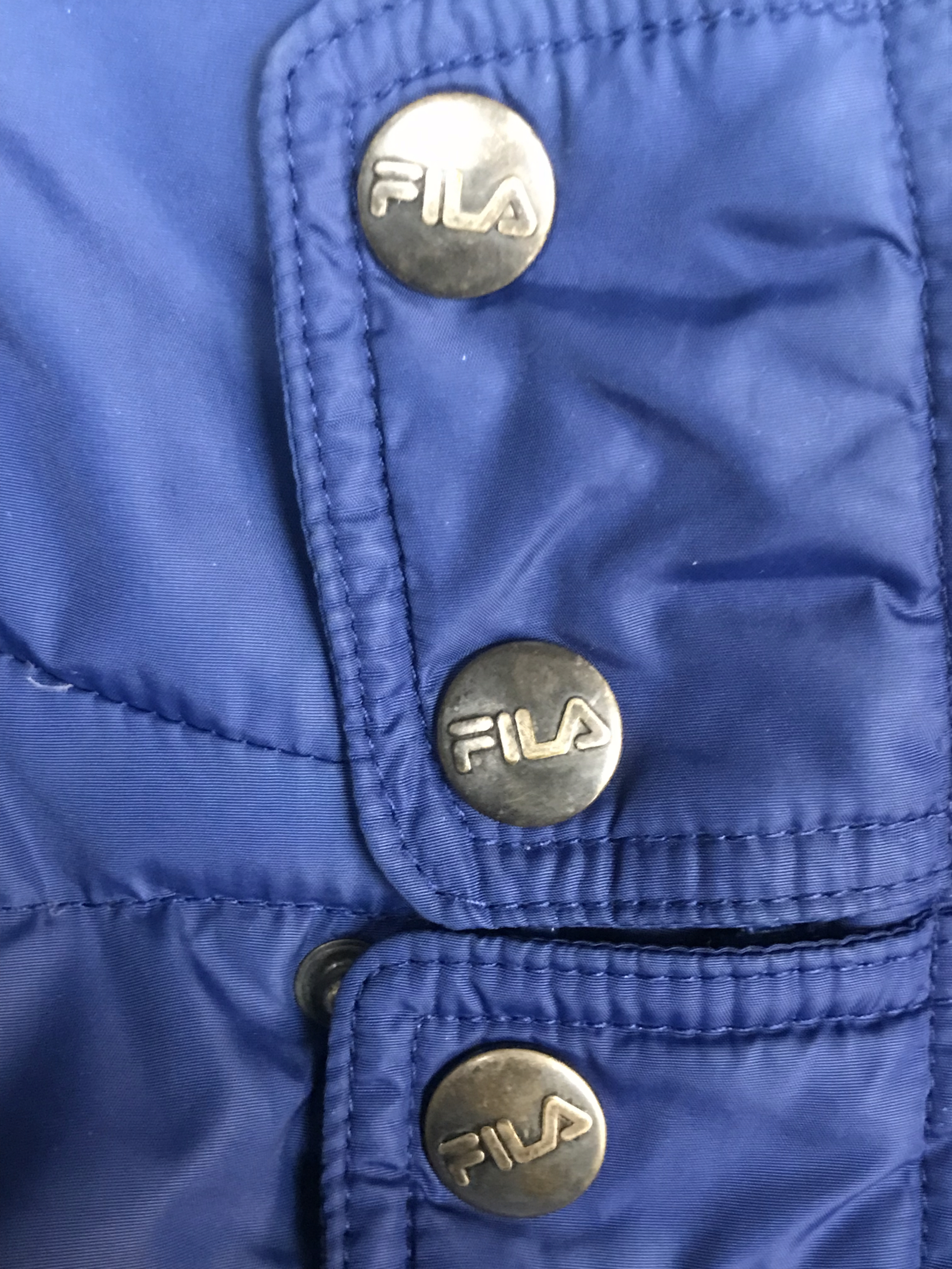 Blaue Daunenjacke von Fila. Recht guter Zustand. 2-3 sehr kleine Löcher und ein paar kaum erkennbare dunkle Flecken, die man auf den Fotos sehen kann. Größe fittet S-M.